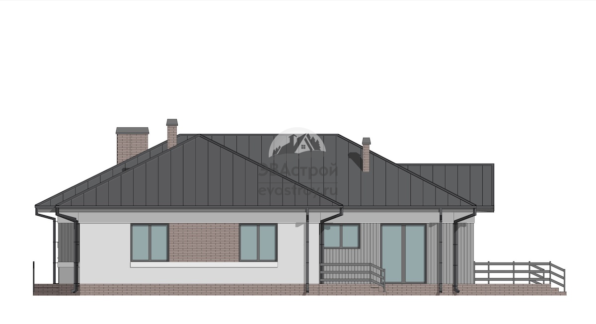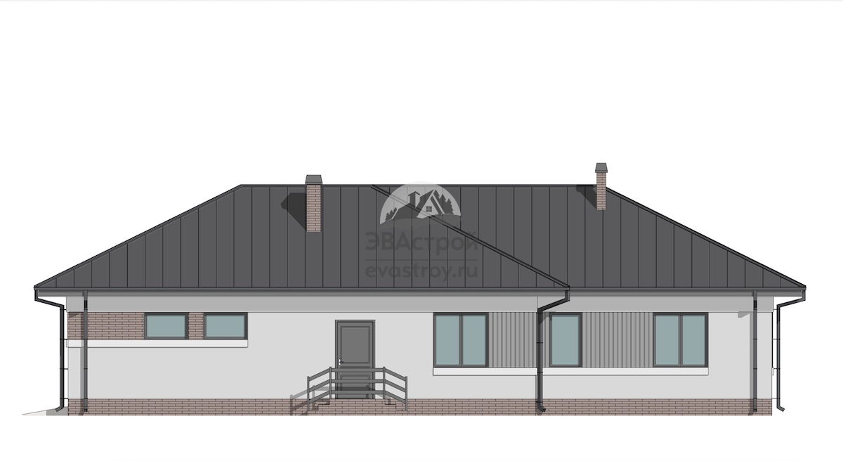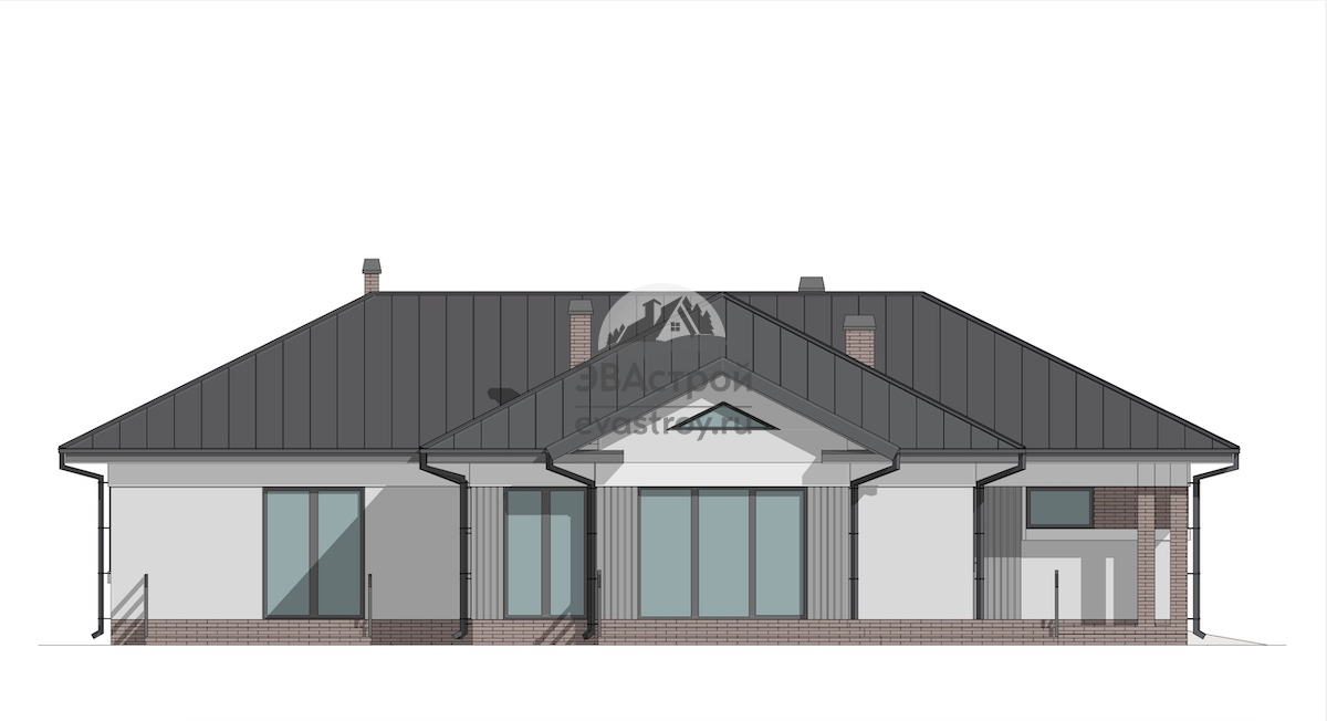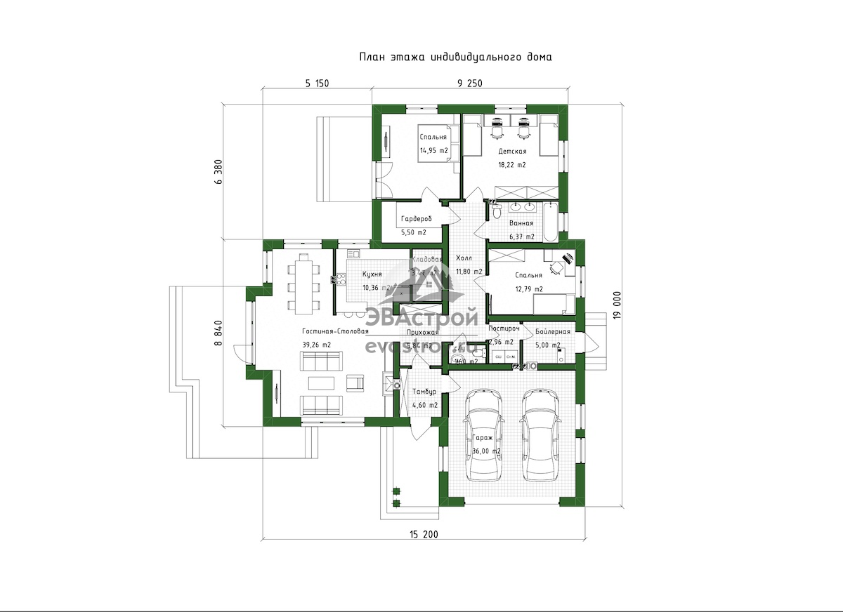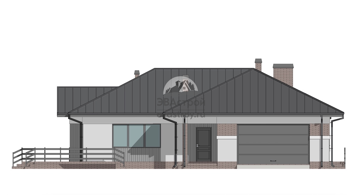Предлагаем вашему вниманию индивидуальный проект одноэтажного дома. Он выполнен в европейском стиле, его общая площадь составляет 178 м2, а габариты – 19 х 16 м. Дом предназначен для круглогодичного проживания, в нем имеется две террасы и двухместный гараж. Дом выполняется из газобетонных блоков D500 В3,5-400 мм с наружным утеплением минеральными плитами. Толщина утеплителя составляет 50 мм. Фундамент выполнен из ФБС-блоков, перекрытия – по деревянным балкам. Крыша дома сложная, многощипцовая, с современным фальцевым покрытием. В наружной отделке использована комбинация различных материалов, здесь есть и клинкерная плитка, и фасадная штукатурка, и планкен. Давайте зайдем в дом. За входной дверью расположен тамбур, его площадь 4,6 м2. У левой стены тамбура поместится вместительный шкаф для одежды. Дверь слева ведет в гараж. Площадь гаража 36 м2, он рассчитан на два автомобиля, есть несколько окон. Выезд и въезд машин в гараж осуществляется через общие подъемные ворота. Из тамбура выходим в прихожую, ее площадь 6 м2. И здесь также можно разместить встроенный шкаф. Слева от прихожей находится гостиная-столовая, ее площадь 39 м2, есть мягкая группа и обеденный стол. Рядом с гостиной-столовой располагается кухня площадью 10 м2, а рядом есть удобная кладовка 3 м2, где можно поставить вместительный стеллаж. Обратите внимание на камин с живым огнем, который будет согревать вас в холодные дни. Большое окно гостиной ведет на открытую террасу. А вот вид на гостиную снаружи и проход через окно. Возвращаемся в прихожую и пройдем в противоположную часть дома. Она начинается холлом, где расположена прачечная 3 м2, из прачечной есть дверь в бойлерную 5 м2, а оттуда – выход на участок. Также в холле расположен туалет, в нем находится раковина и унитаз. Далее по коридору продвигаемся к спальням. Первая комната площадью 13 м2, в ней односпальная кровать, рабочий стол, шкаф. Далее на нашем пути ванная, ее площадь 6 м2, обстановку составляет ванная, двойная раковина и унитаз. Обратите внимание, что в ванной имеется окно. Вторая спальня – это двухместная детская площадью 18 м2. В ней предусмотрен общий рабочий стол, двухъярусная кровать и шкафы для вещей. Вход в хозяйскую спальню осуществляется через гардеробную. Площадь гардеробной 5 м2. Обстановку комнаты составляет двуспальная кровать, настенный телевизор. Как видим, здесь два окна, одно из которых ведет на террасу. Вот так терраса выглядит со стороны улицу. И еще раз общий вид дома. Выглядит очень стильно и современно.